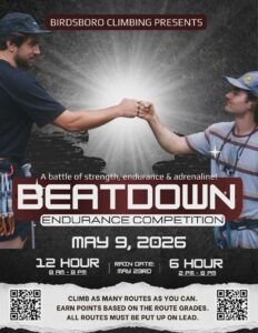 « All Events Birdsboro Beatdown in conjunction with Reach Climbing Gym May 9 @ 8:00 am - 8:00 pm $40 Add to calendar Google Calendar iCalendar Outlook 365 Outlook Live Details Date: May 9 Time: 8:00 am - 8:00 pm Cost: $40 Venue Birdsboro Climbing Quarry Birdsboro, PA United States + Google Map View Venue Website